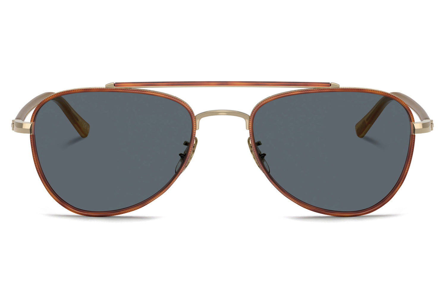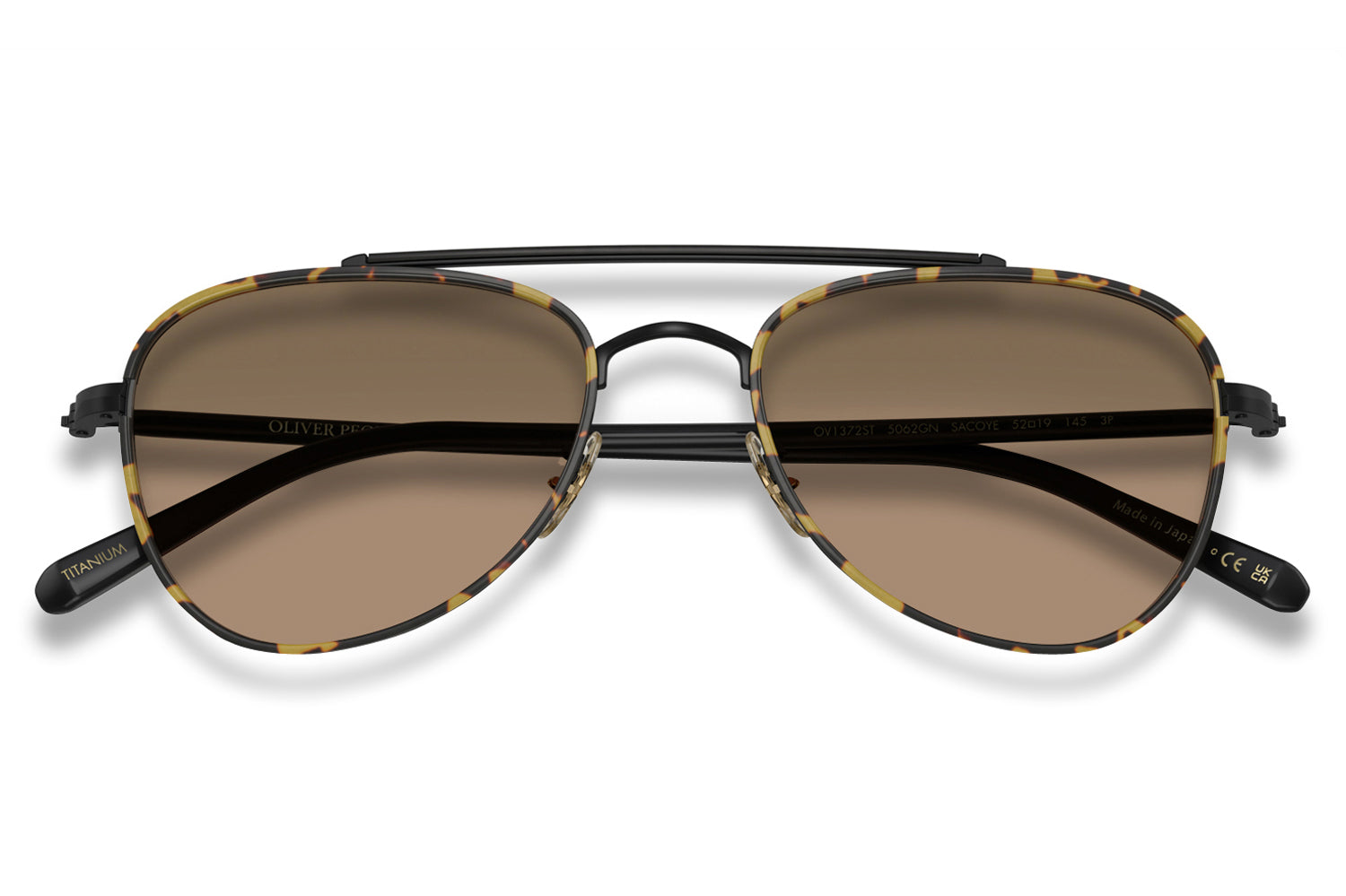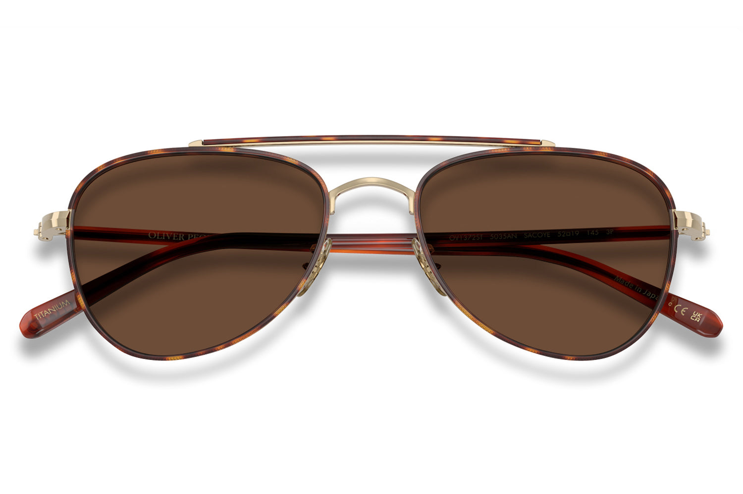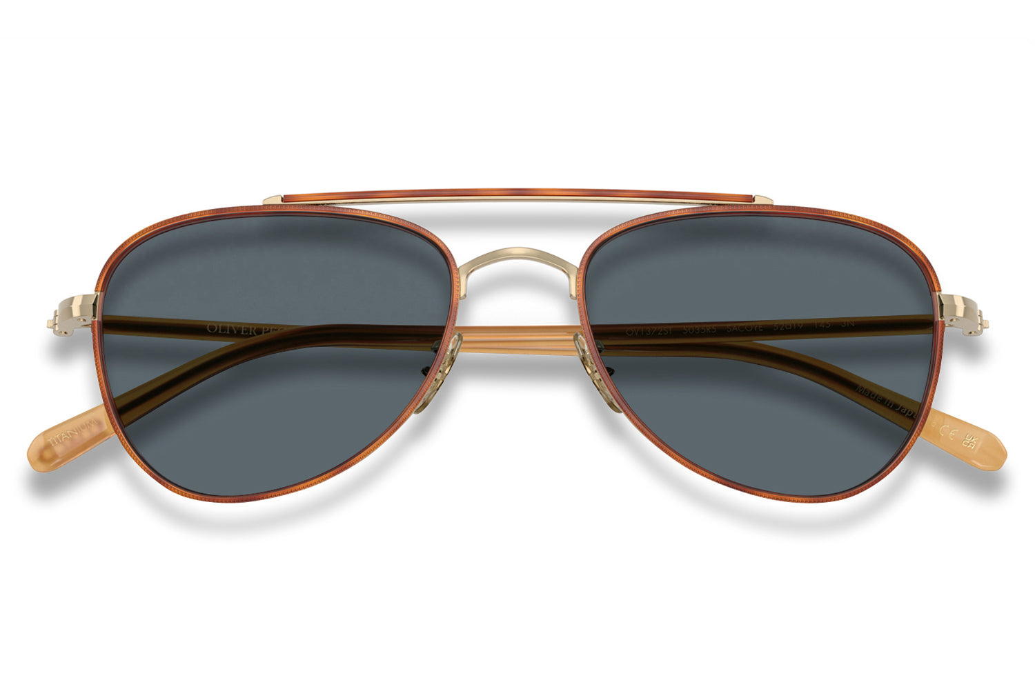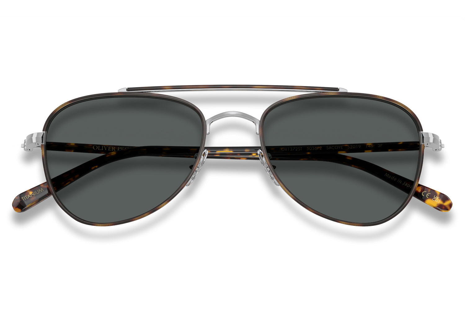 The Oliver Peoples // Sacoye (OV1372ST) is a teardrop titanium and acetate sunglass with a distinctive double-bar brow and rich tortoise accents. Born from Japanese craftsmanship, the thin acetate insert eyewire, tortoise-accented top bar, and refined acetate temple deliver an elegantly tailored, heritage-inspired silhouette. Lightweight titanium and premium acetate construction ensure enduring comfort and refined wear. These designer sunglasses blend classic aviator heritage with artisanal precision, perfect for the discerning wearer seeking a beautifully crafted, tailored elegance. Includes Oliver Peoples box, case, cleaning cloth, and 1-year manufacturer warranty.