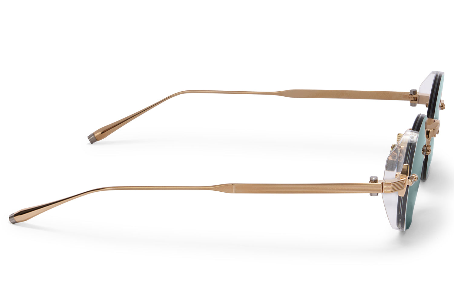 The Akoni // Jupiter pays homage to NASA's Juno spacecraft and the immense power of the solar system's largest planet. Drawing inspiration from the Eris model, this rimless Japanese titanium frame achieves a dynamic interplay of strength and lightness, acetate side shields secured with nylon thread hold the lenses firmly within sculpted side cups with quiet mechanical precision. Flat-profile temples contrast against rounded branded titanium tips, adding a refined, futuristic edge. Ceramic nose pads on beta-titanium arms ensure enduring comfort. Akoni sunglasses, made in Japan. Includes Akoni box, case, cleaning cloth, and 1-year manufacturer warranty.