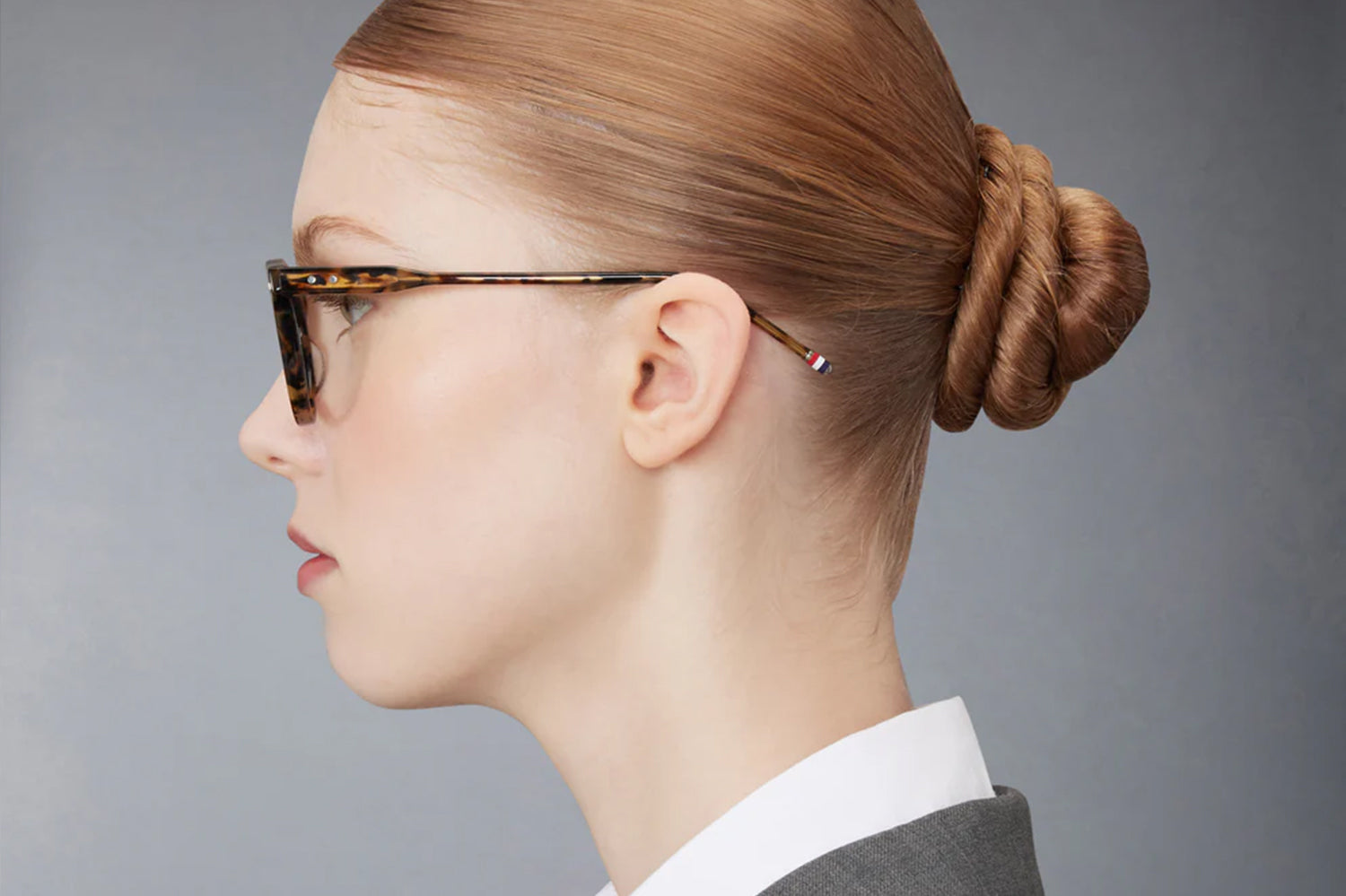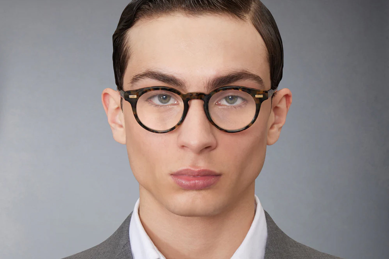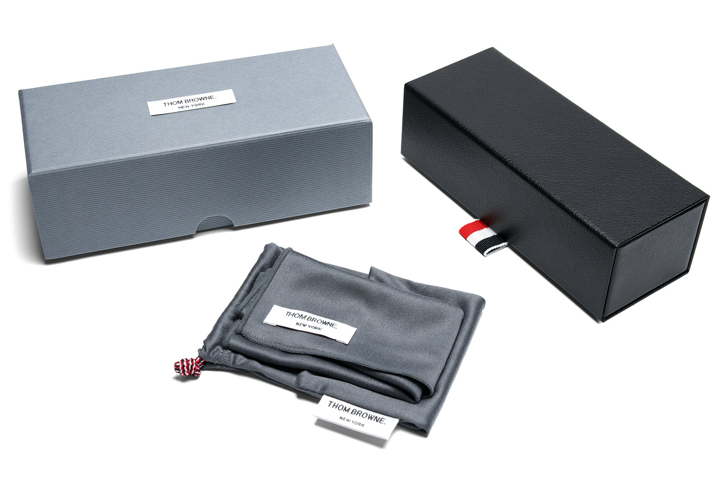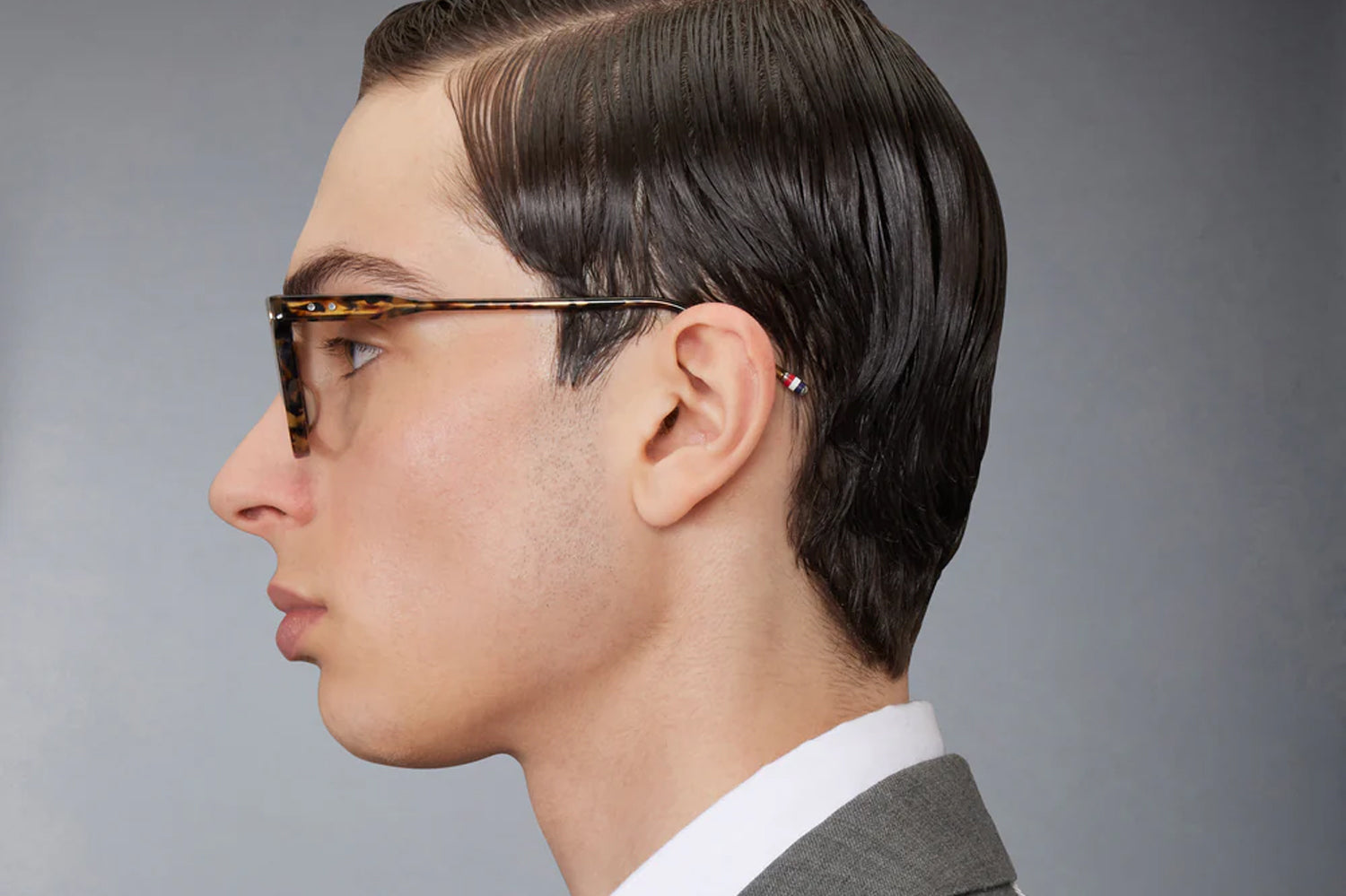 Thom Browne brought eyewear in-house in 2024, taking full creative control of the collection. It extends the brand's signature language — mid-century shapes, precise proportions, four-bar detailing at the hinge, and a tricolor enamel tip finishing each temple. Each frame is handcrafted in Japan from acetate and titanium, finished over three months through a tumbling and aging process that gives the material a lived-in depth of color.