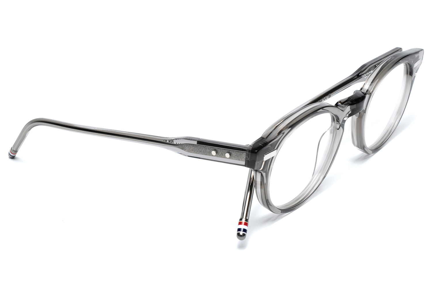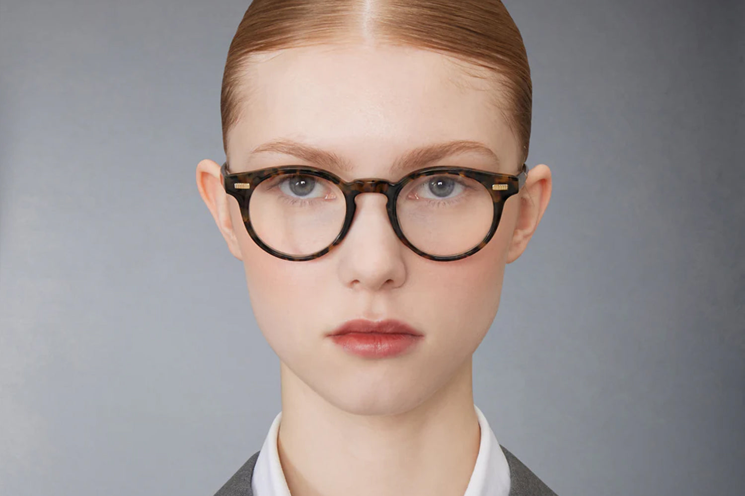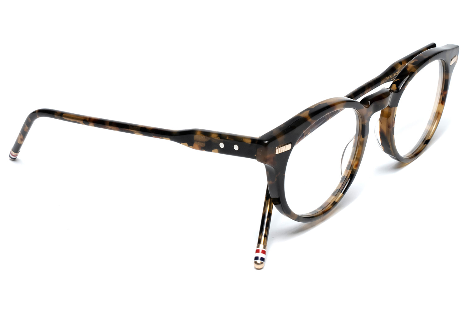 Thom Browne brought eyewear in-house in 2024, taking full creative control of the collection. It extends the brand's signature language — mid-century shapes, precise proportions, four-bar detailing at the hinge, and a tricolor enamel tip finishing each temple. Each frame is handcrafted in Japan from acetate and titanium, finished over three months through a tumbling and aging process that gives the material a lived-in depth of color.