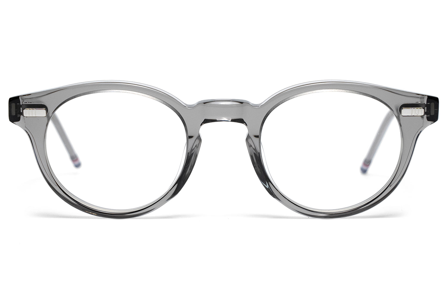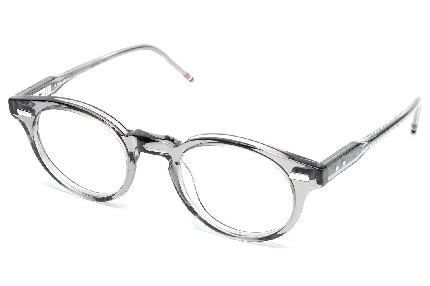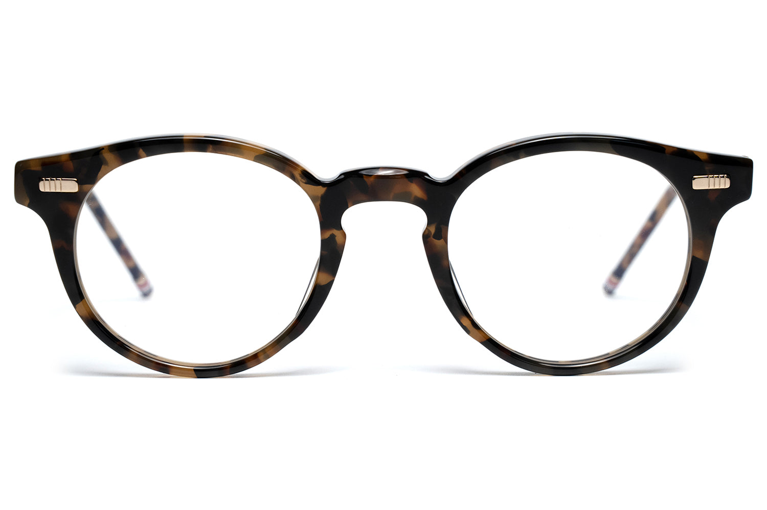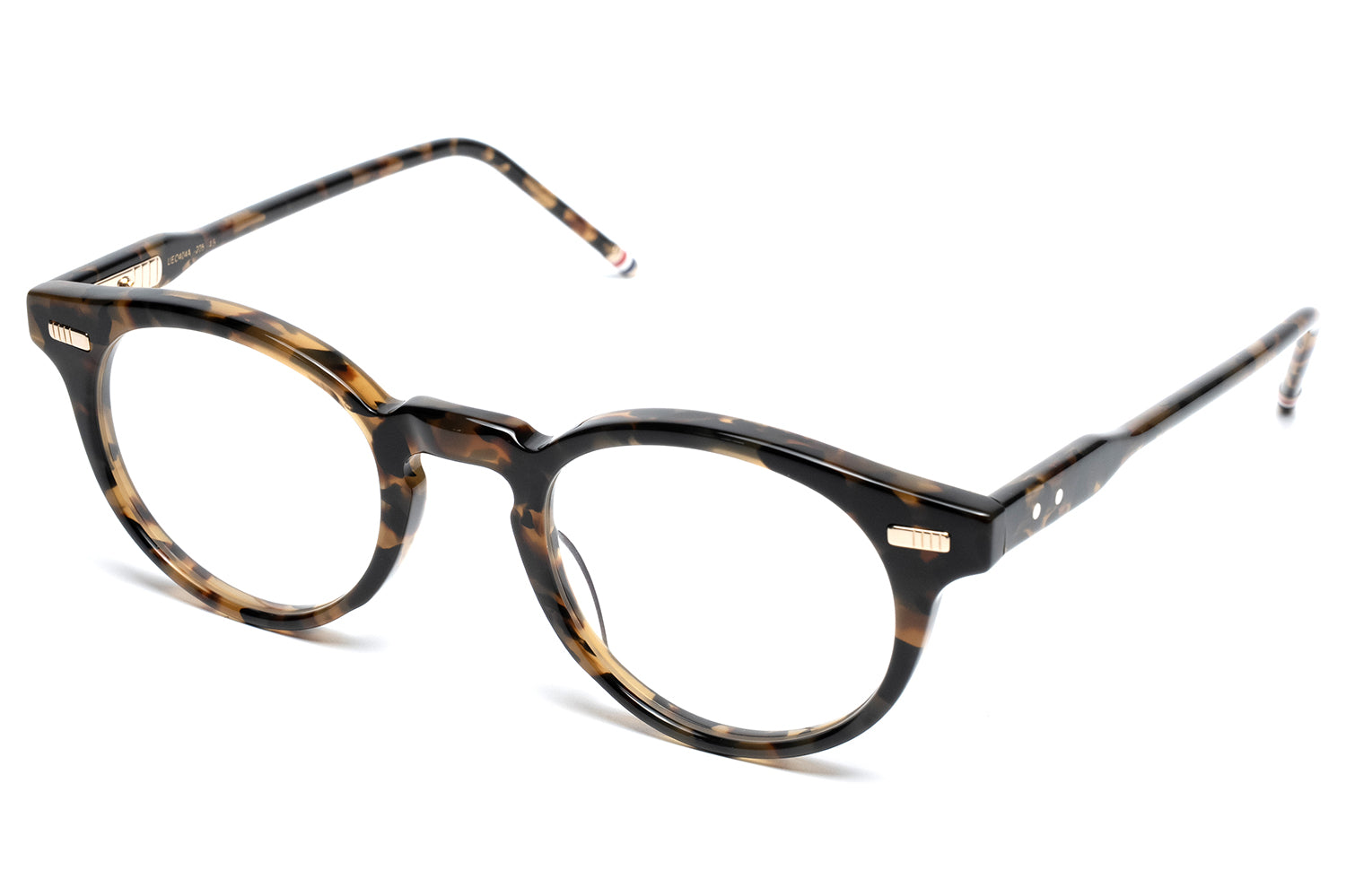 Thom Browne brought eyewear in-house in 2024, taking full creative control of the collection. It extends the brand's signature language — mid-century shapes, precise proportions, four-bar detailing at the hinge, and a tricolor enamel tip finishing each temple. Each frame is handcrafted in Japan from acetate and titanium, finished over three months through a tumbling and aging process that gives the material a lived-in depth of color.