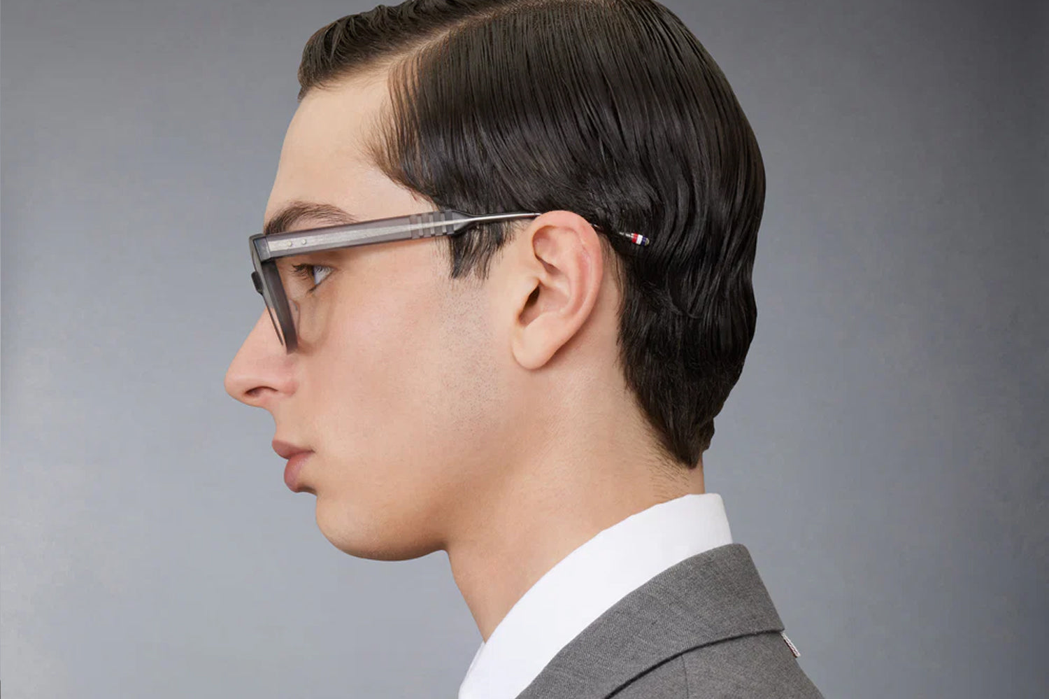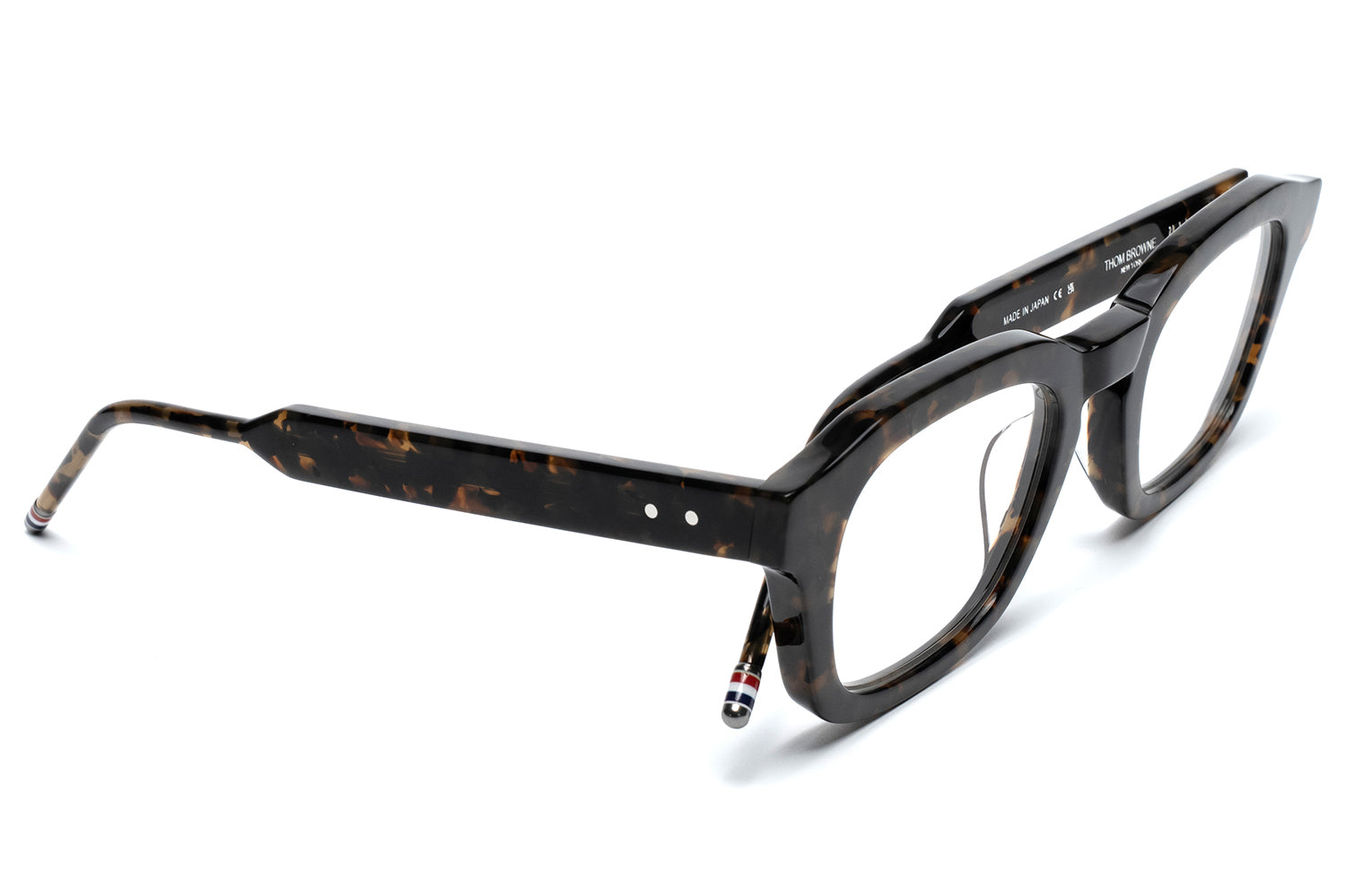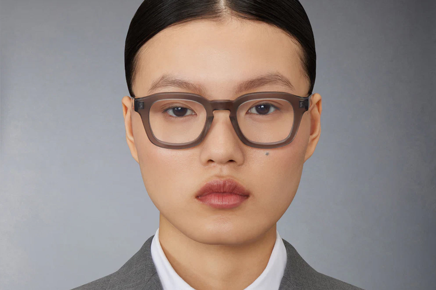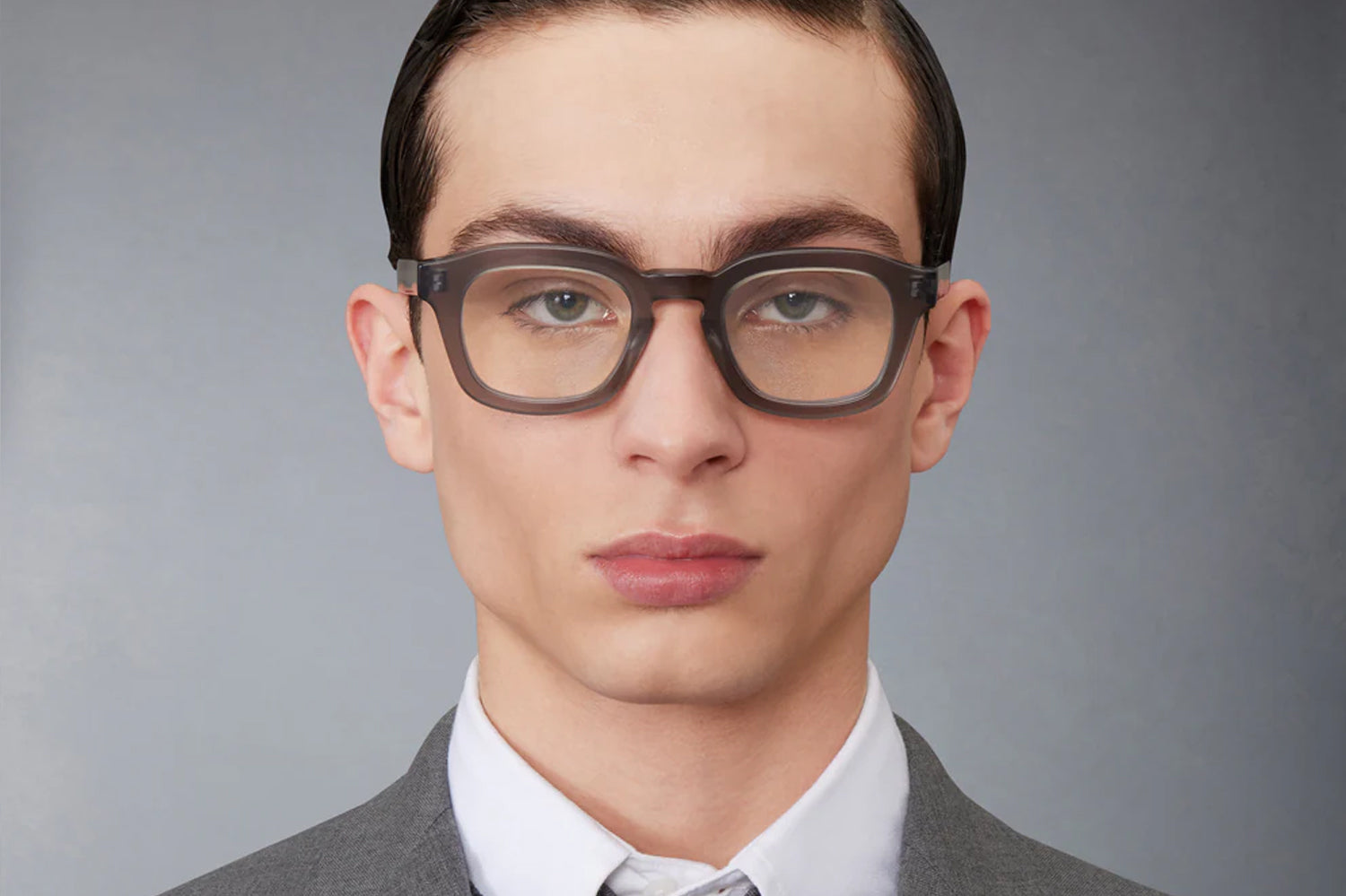 Thom Browne brought eyewear in-house in 2024, taking full creative control of the collection. It extends the brand's signature language — mid-century shapes, precise proportions, four-bar detailing at the hinge, and a tricolor enamel tip finishing each temple. Each frame is handcrafted in Japan from acetate and titanium, finished over three months through a tumbling and aging process that gives the material a lived-in depth of color.