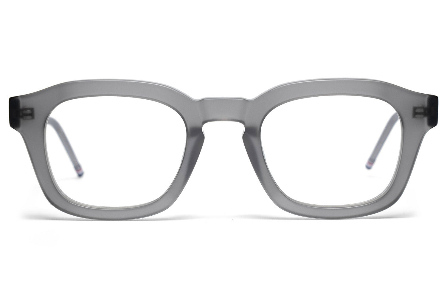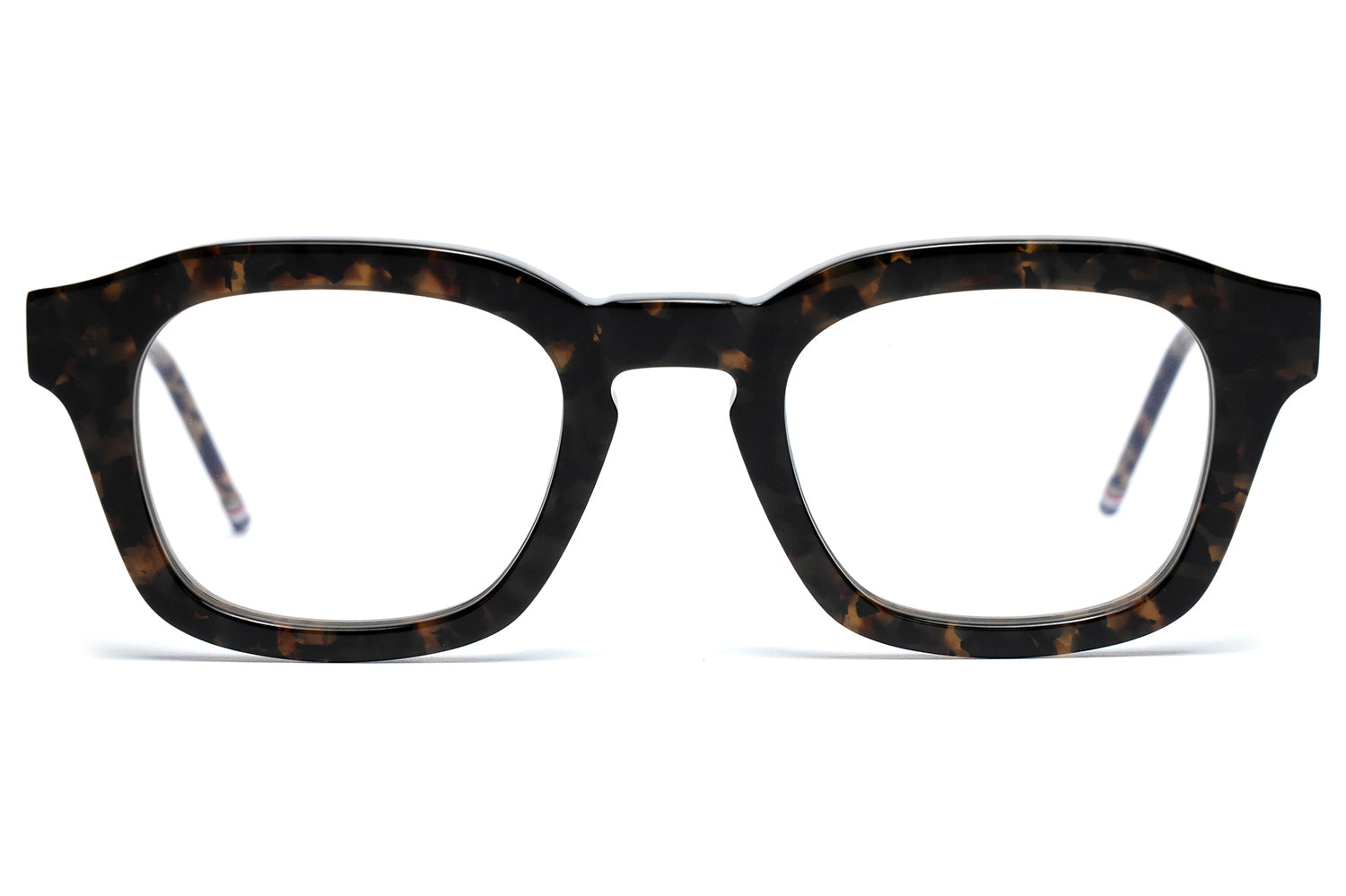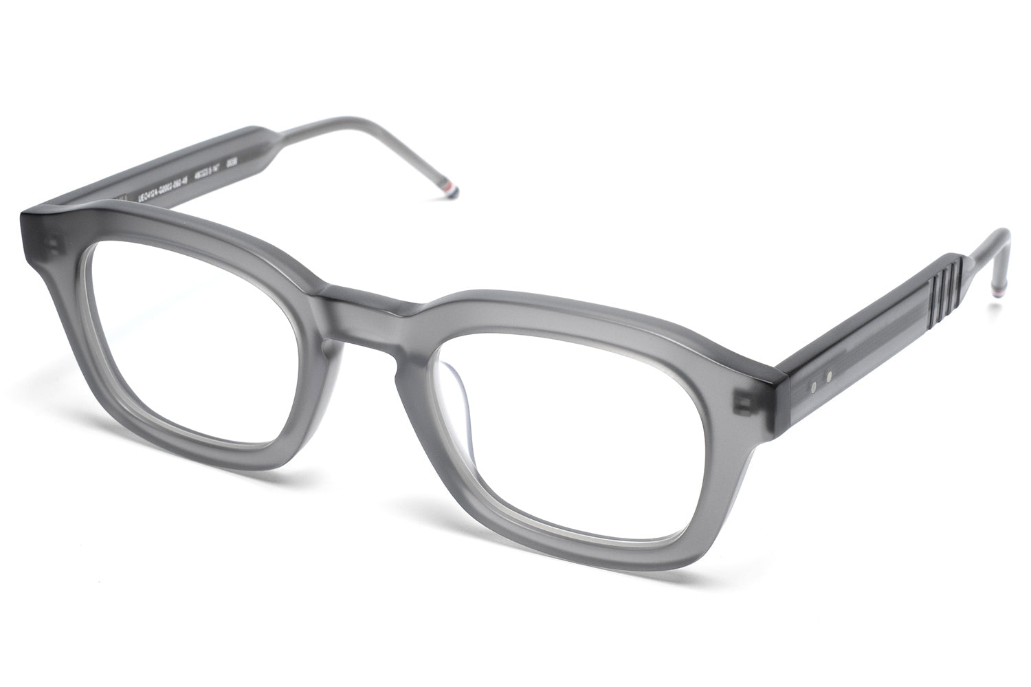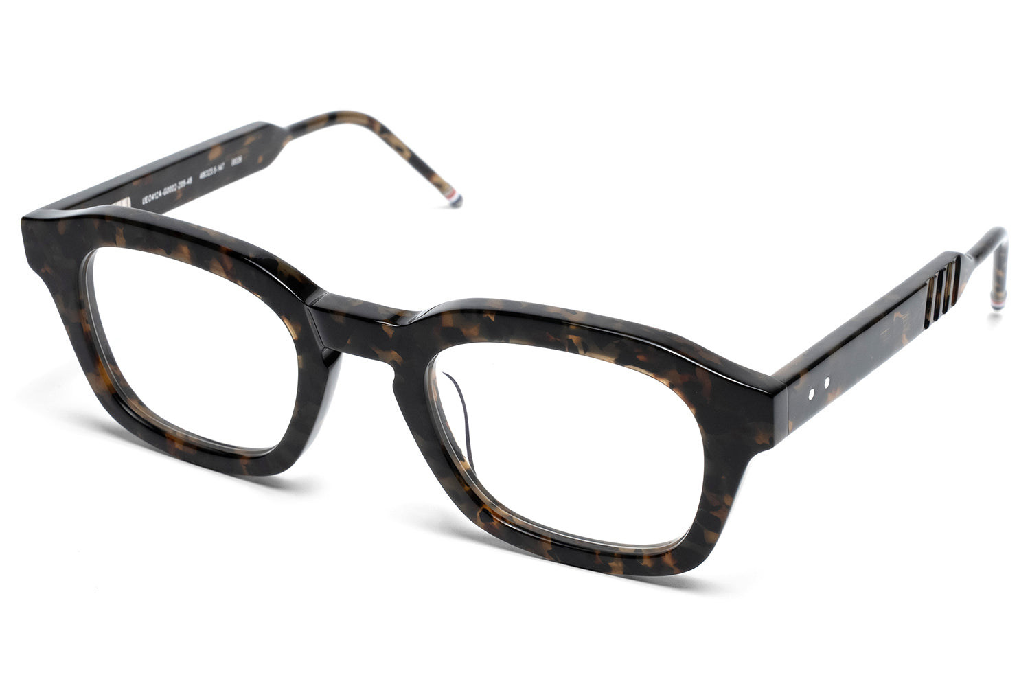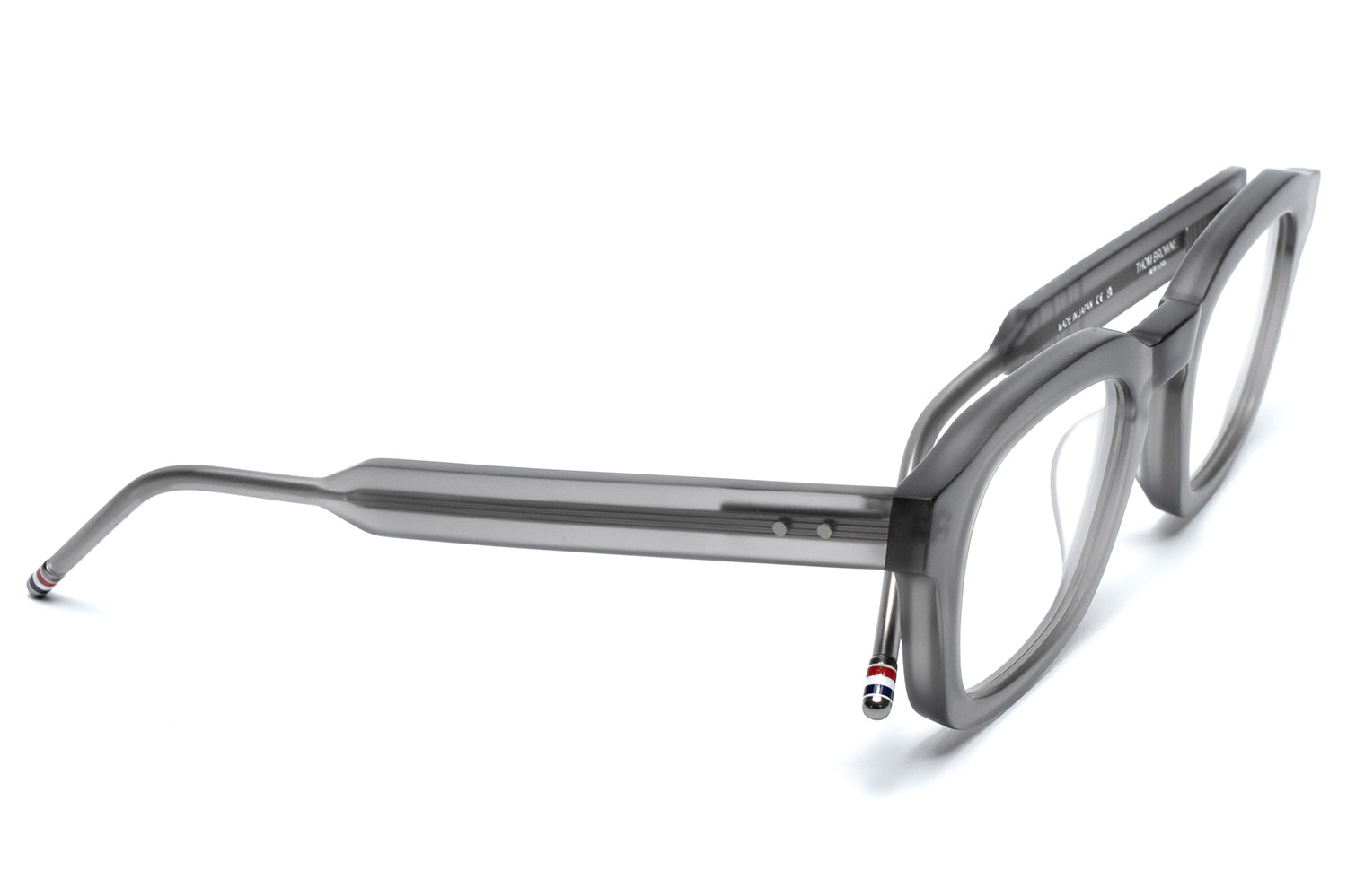 Thom Browne brought eyewear in-house in 2024, taking full creative control of the collection. It extends the brand's signature language — mid-century shapes, precise proportions, four-bar detailing at the hinge, and a tricolor enamel tip finishing each temple. Each frame is handcrafted in Japan from acetate and titanium, finished over three months through a tumbling and aging process that gives the material a lived-in depth of color.