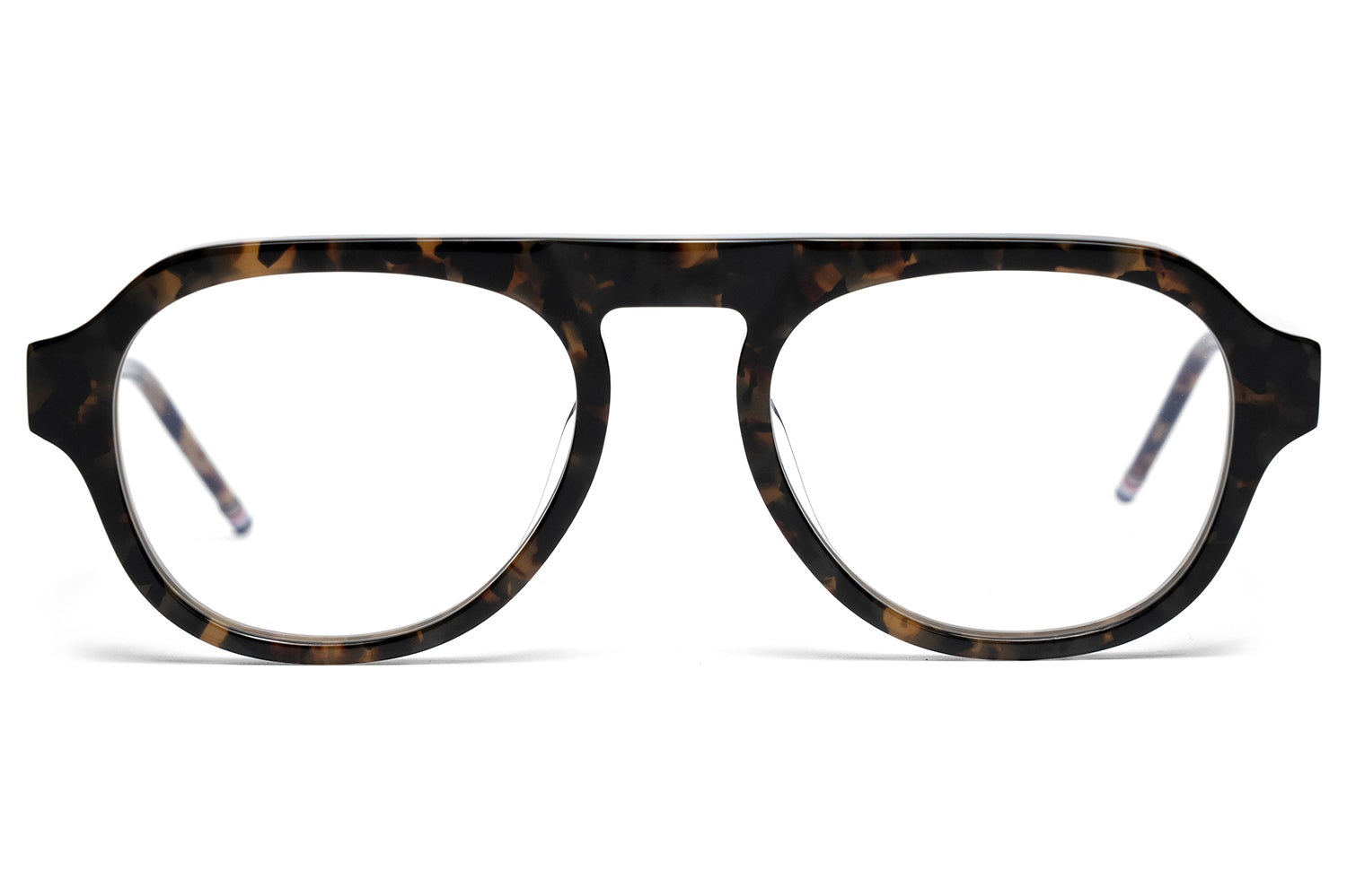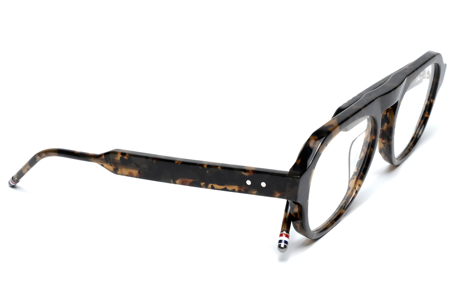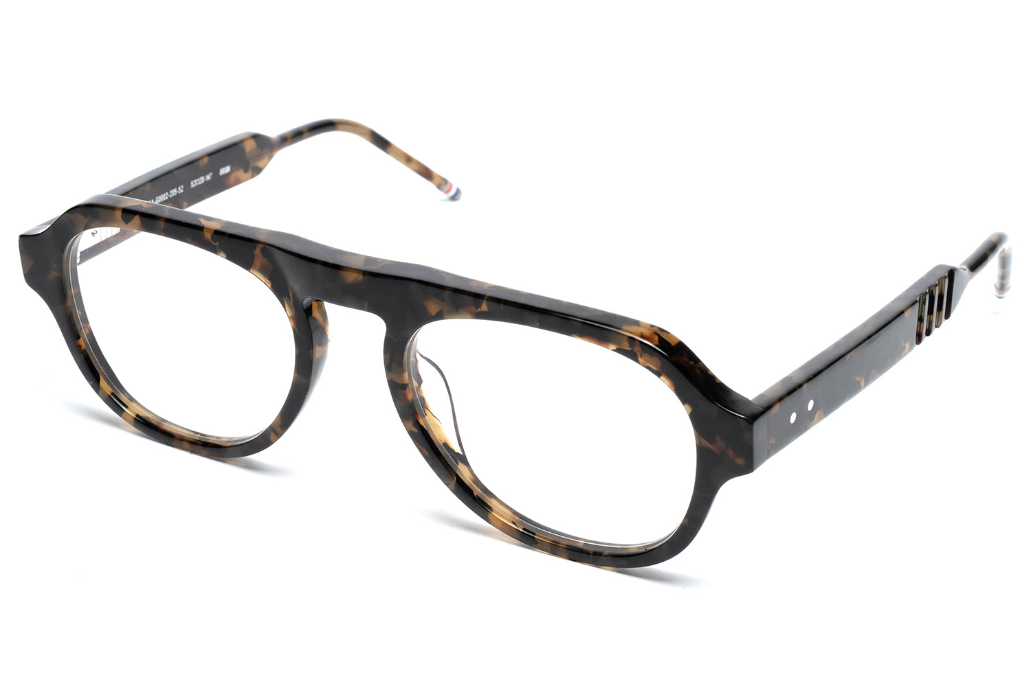 Thom Browne brought eyewear in-house in 2024, taking full creative control of the collection. It extends the brand's signature language — mid-century shapes, precise proportions, four-bar detailing at the hinge, and a tricolor enamel tip finishing each temple. Each frame is handcrafted in Japan from acetate and titanium, finished over three months through a tumbling and aging process that gives the material a lived-in depth of color.