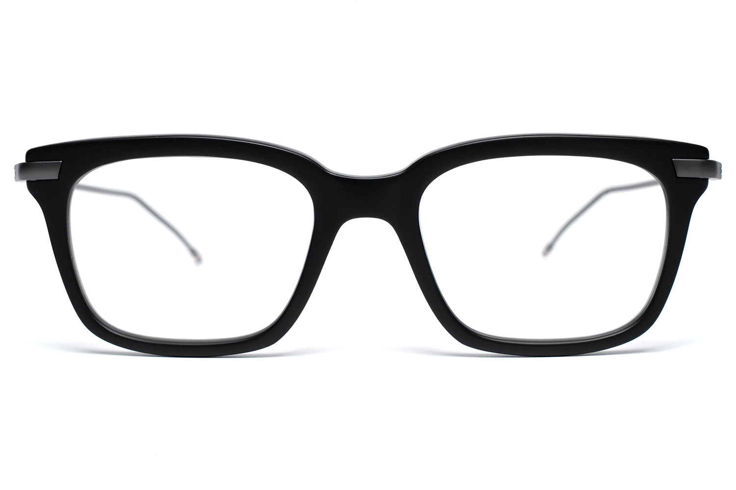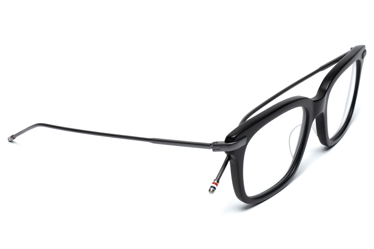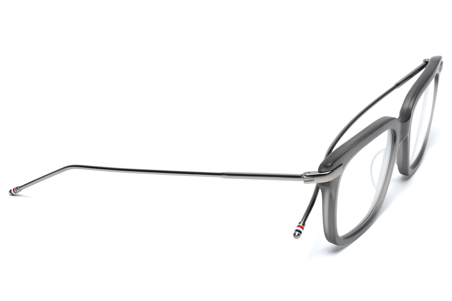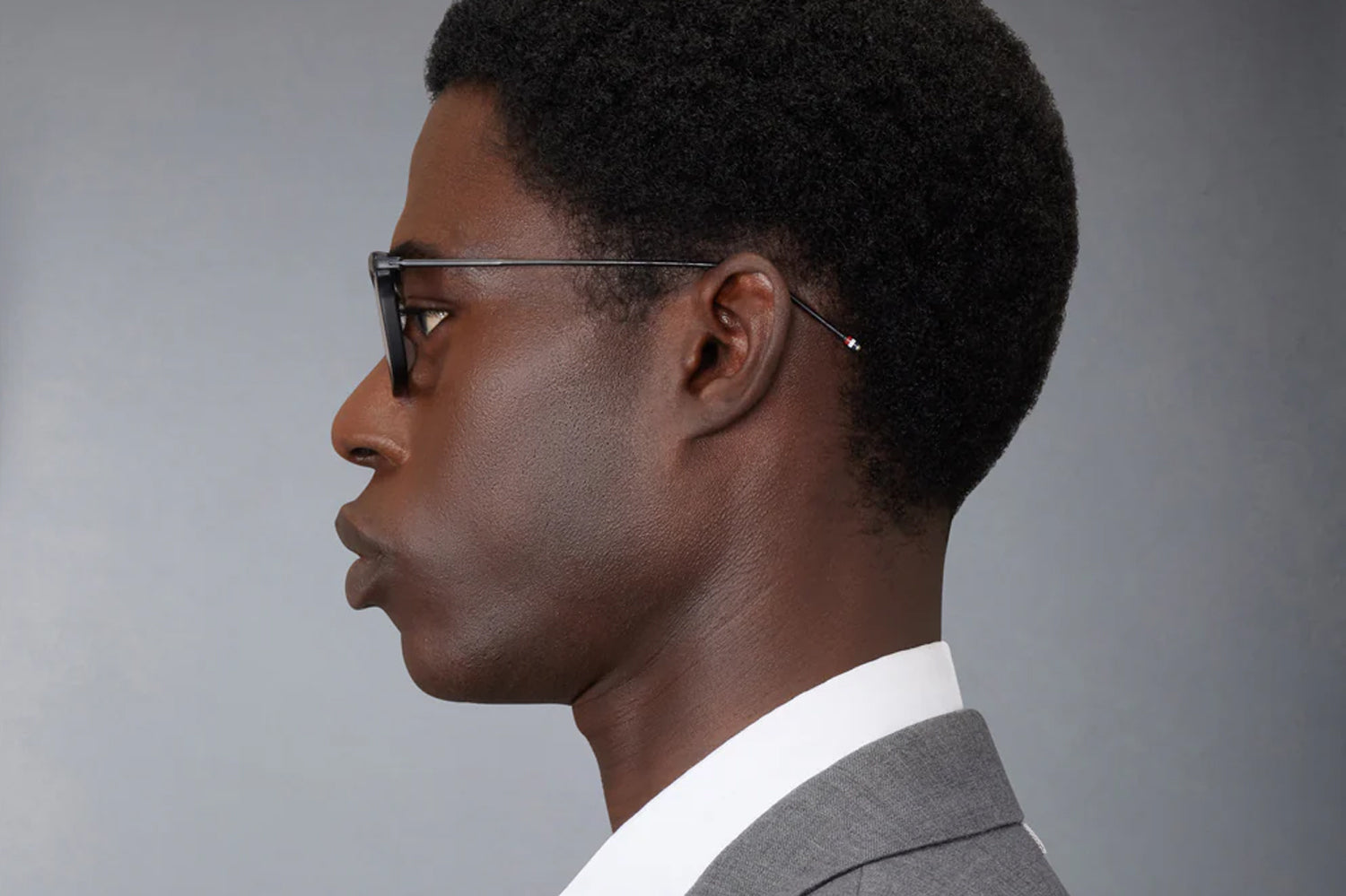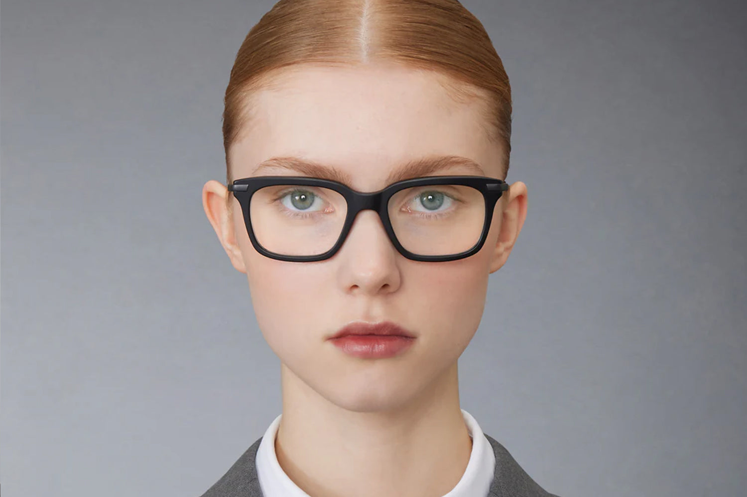 Thom Browne brought eyewear in-house in 2024, taking full creative control of the collection. It extends the brand's signature language — mid-century shapes, precise proportions, four-bar detailing at the hinge, and a tricolor enamel tip finishing each temple. Each frame is handcrafted in Japan from acetate and titanium, finished over three months through a tumbling and aging process that gives the material a lived-in depth of color.