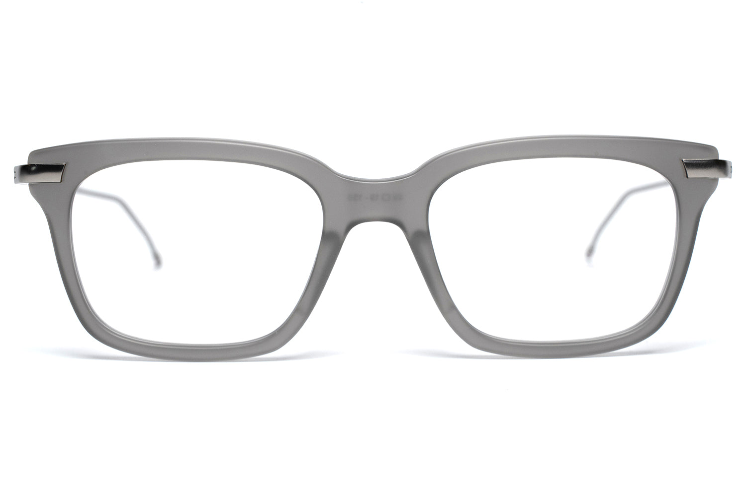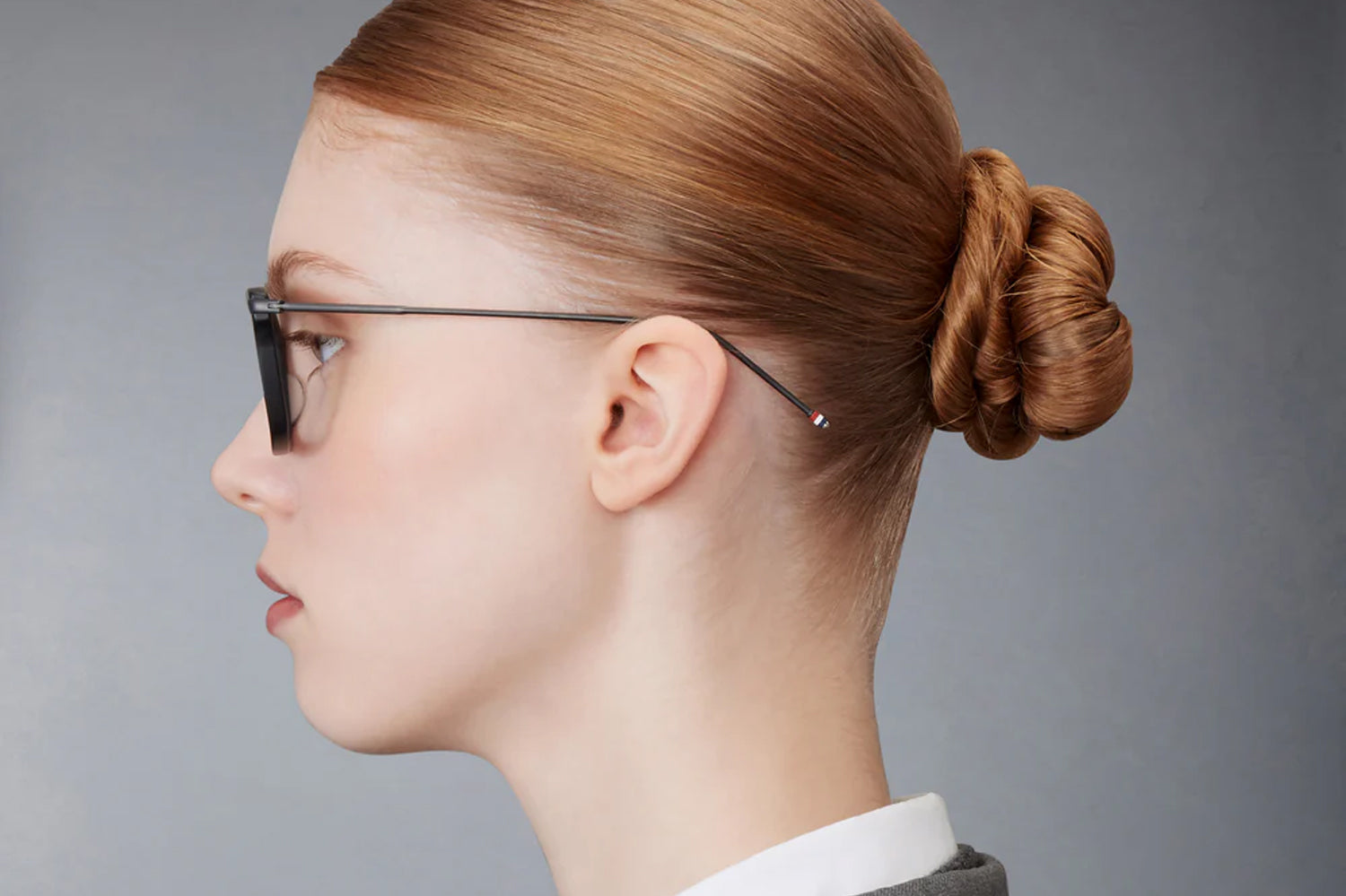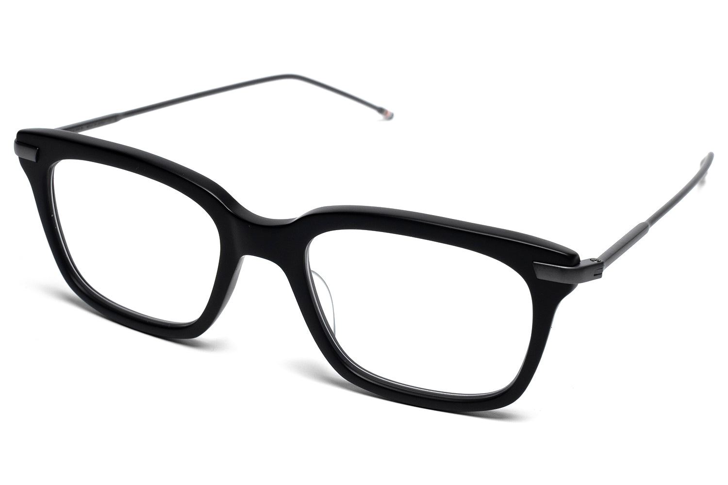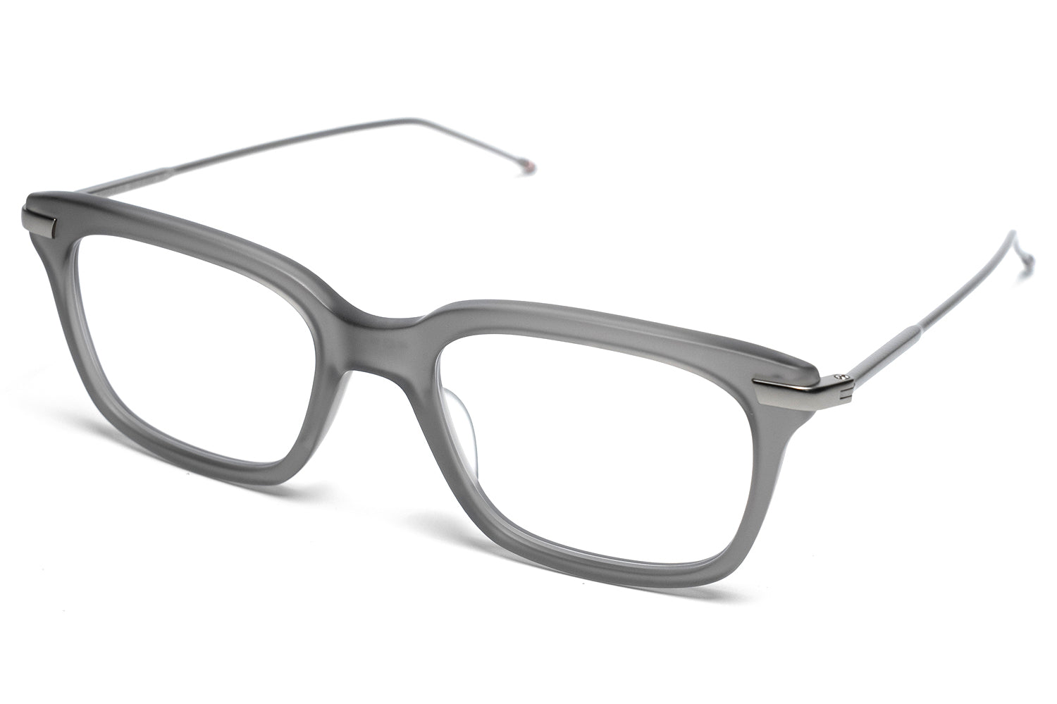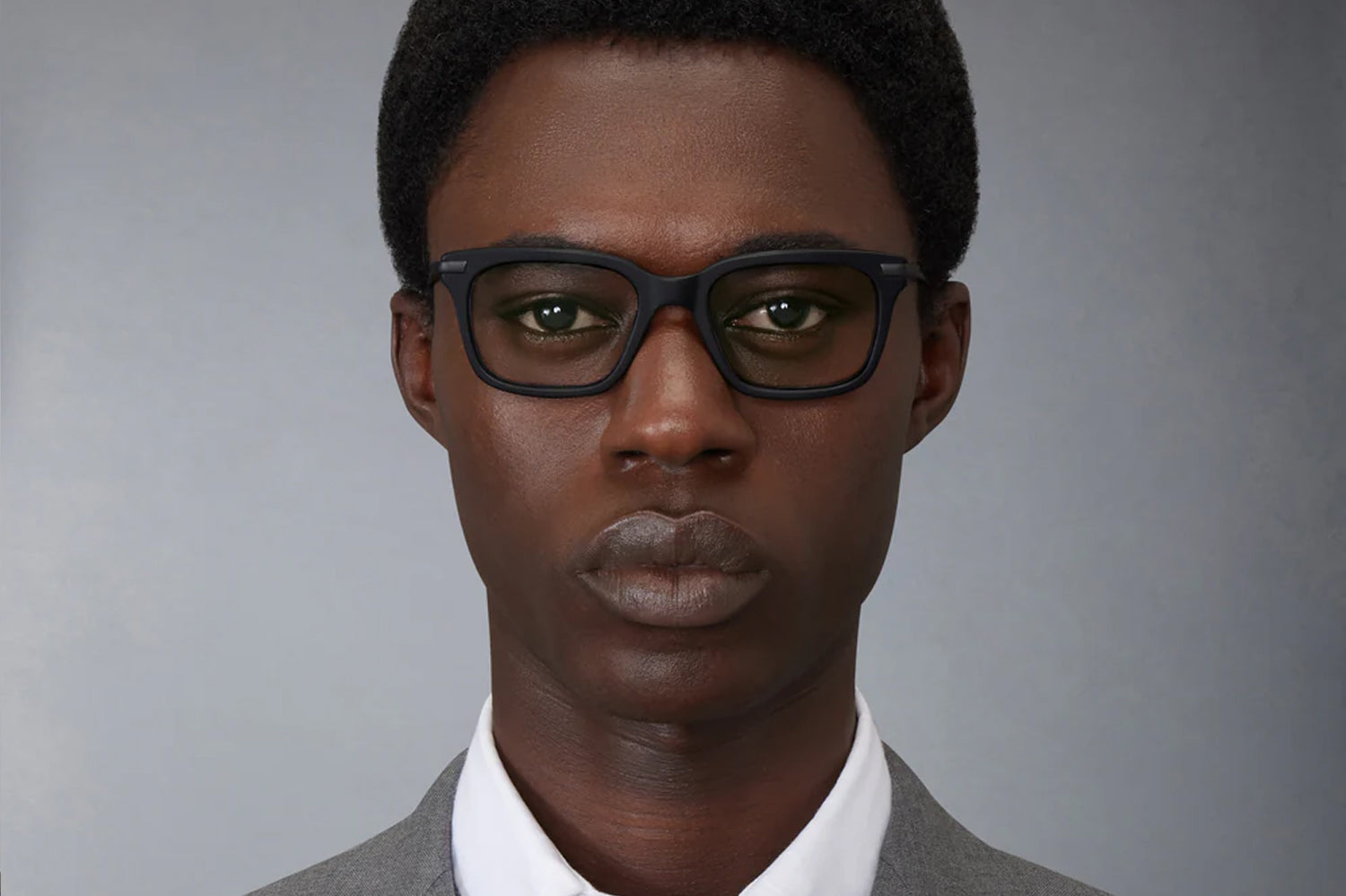 Thom Browne brought eyewear in-house in 2024, taking full creative control of the collection. It extends the brand's signature language — mid-century shapes, precise proportions, four-bar detailing at the hinge, and a tricolor enamel tip finishing each temple. Each frame is handcrafted in Japan from acetate and titanium, finished over three months through a tumbling and aging process that gives the material a lived-in depth of color.