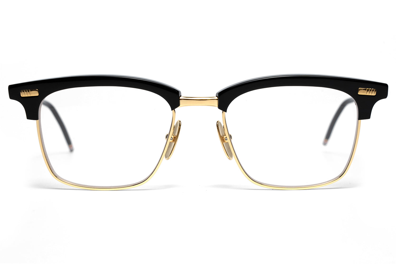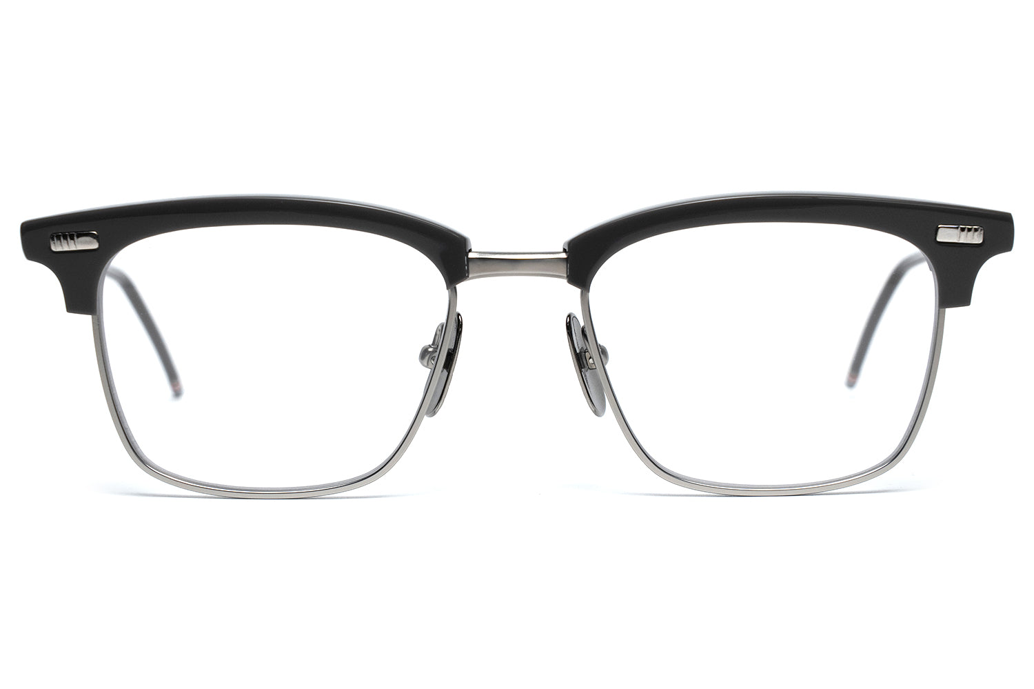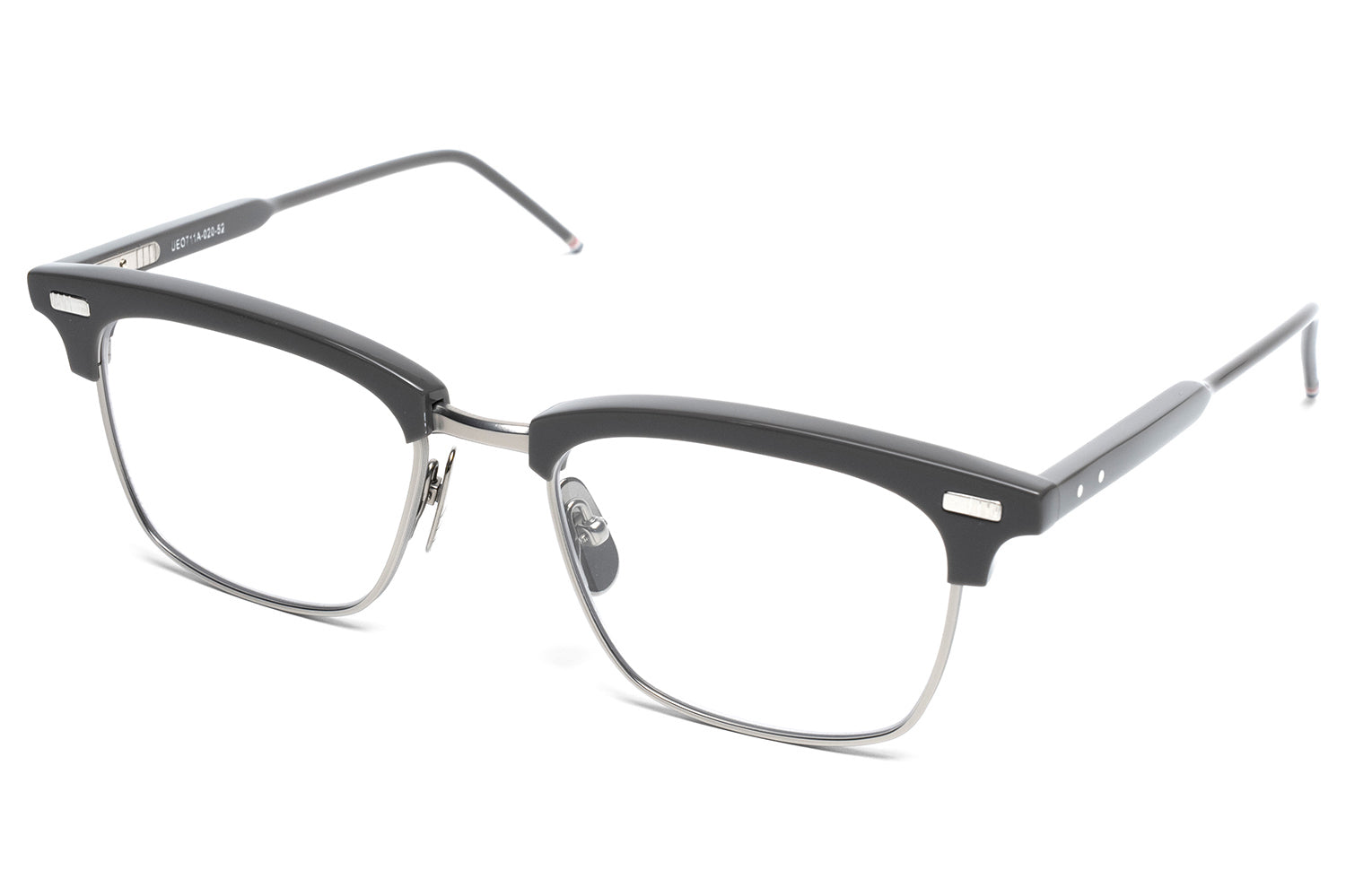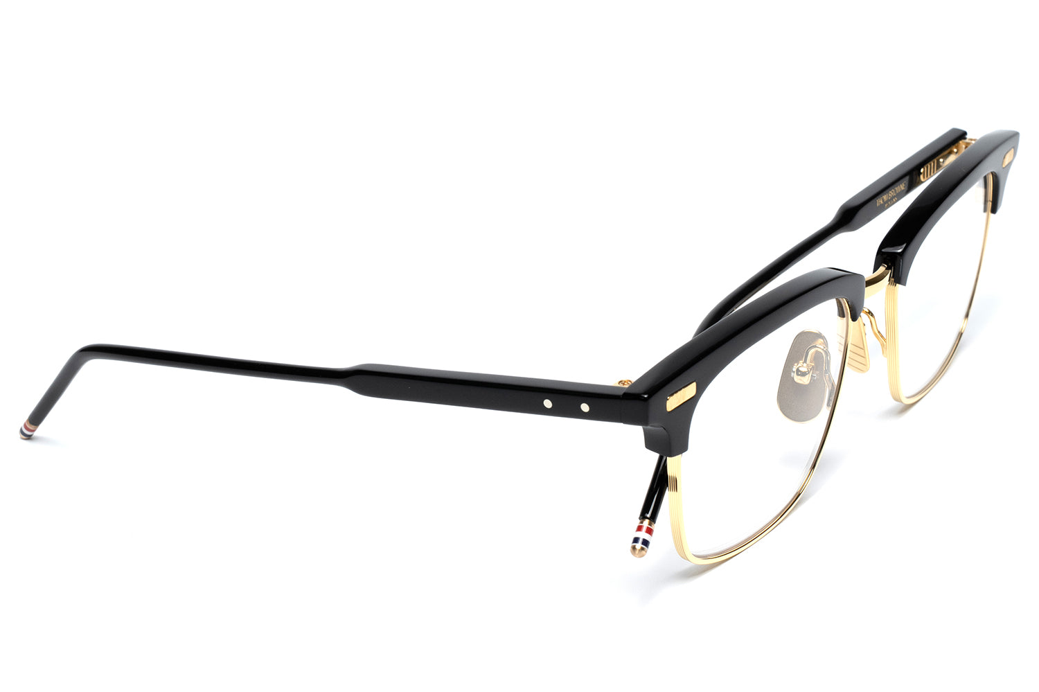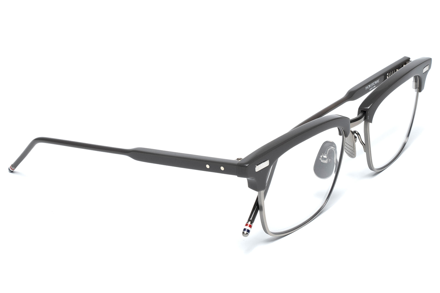 Thom Browne brought eyewear in-house in 2024, taking full creative control of the collection. It extends the brand's signature language — mid-century shapes, precise proportions, four-bar detailing at the hinge, and a tricolor enamel tip finishing each temple. Each frame is handcrafted in Japan from acetate and titanium, finished over three months through a tumbling and aging process that gives the material a lived-in depth of color.