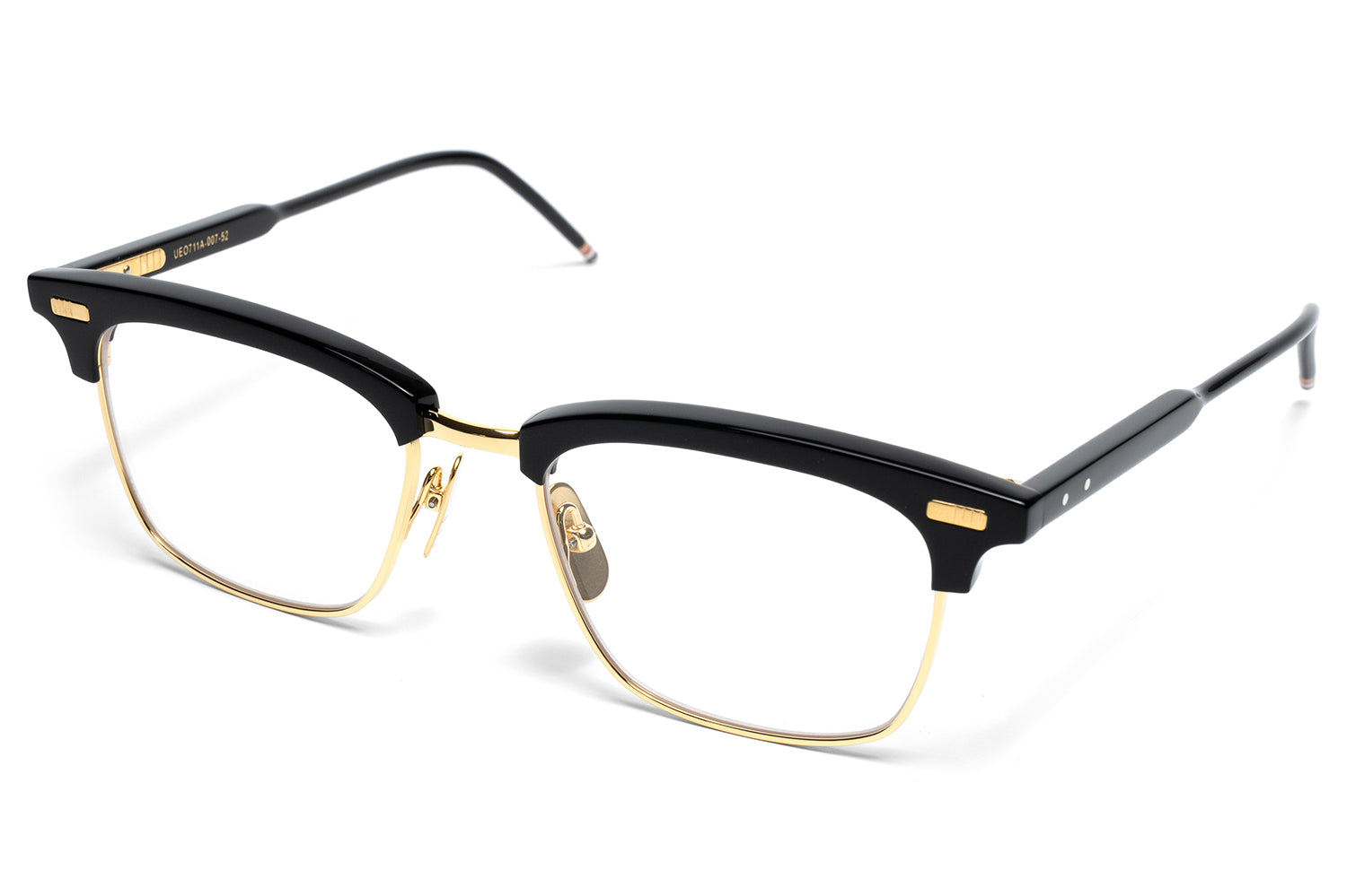The Thom Browne - UEO711A features a refined rectangular browline silhouette in premium acetate with signature 4-bar gold hardware and iconic red, white, and blue striped temple tips. Born from Thom Browne's American heritage and mid-century inspiration, these optical frames blend structured minimalism with architectural clarity and uncompromising attention to detail. Handcrafted in Japan using time-cured Japanese acetate with 18k gold-plated and silver titanium lower rims and bridge. Presented in signature Thom Browne packaging with a hard case, soft case, cleaning cloth, and 1-year manufacturer warranty.