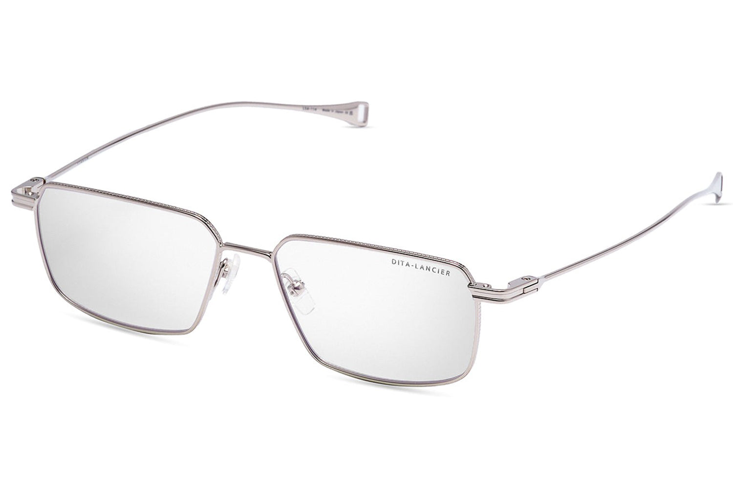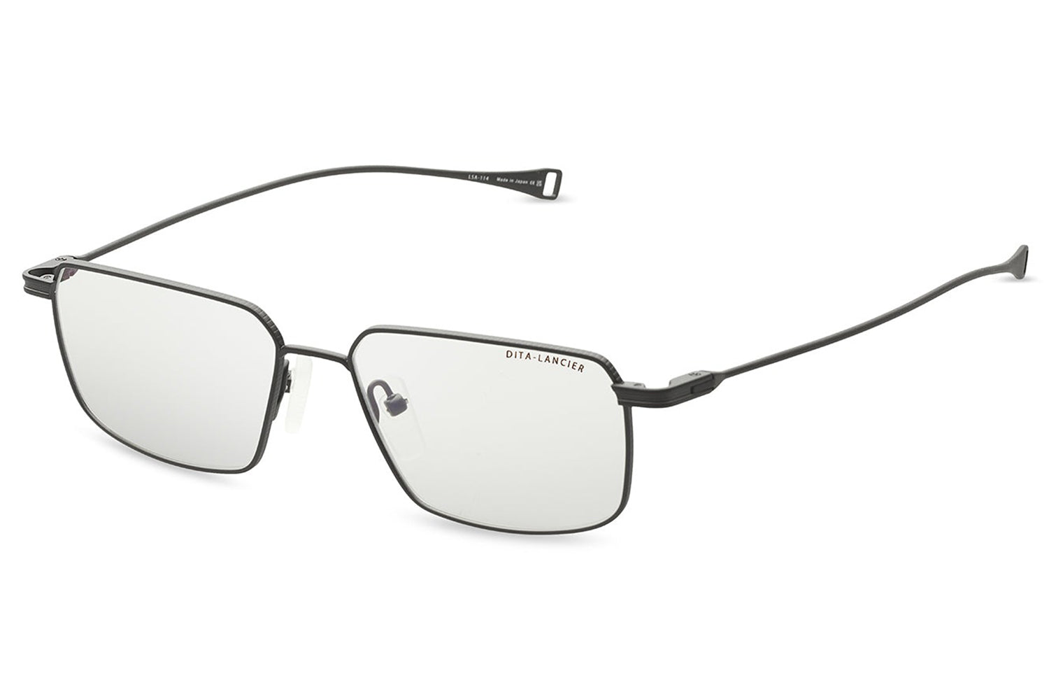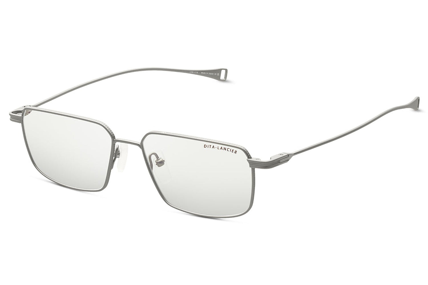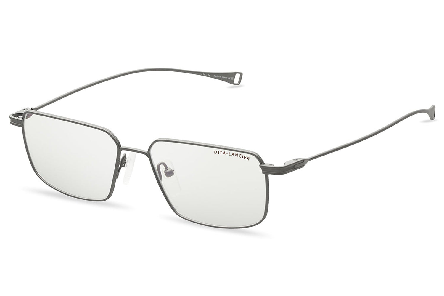 The Dita Lancier - LSA-114 is a titanium optical design distilled to its essentials. A wide rectangular silhouette in ultra-fine titanium wire, its clean geometry is refined by coin-pressed relief along the lens rim, precise, considered, and entirely intentional. The low-profile bridge keeps the frame honest, while swaged temples taper from round to flat with integrated end-tips. Adjustable soft-touch nose pads complete a frame of quiet authority. This DITA-Lancier optical, made in Japan, is available with luxury high-definition prescription lenses. Presented with the Dita Lancier box, case, and cleaning cloth.
